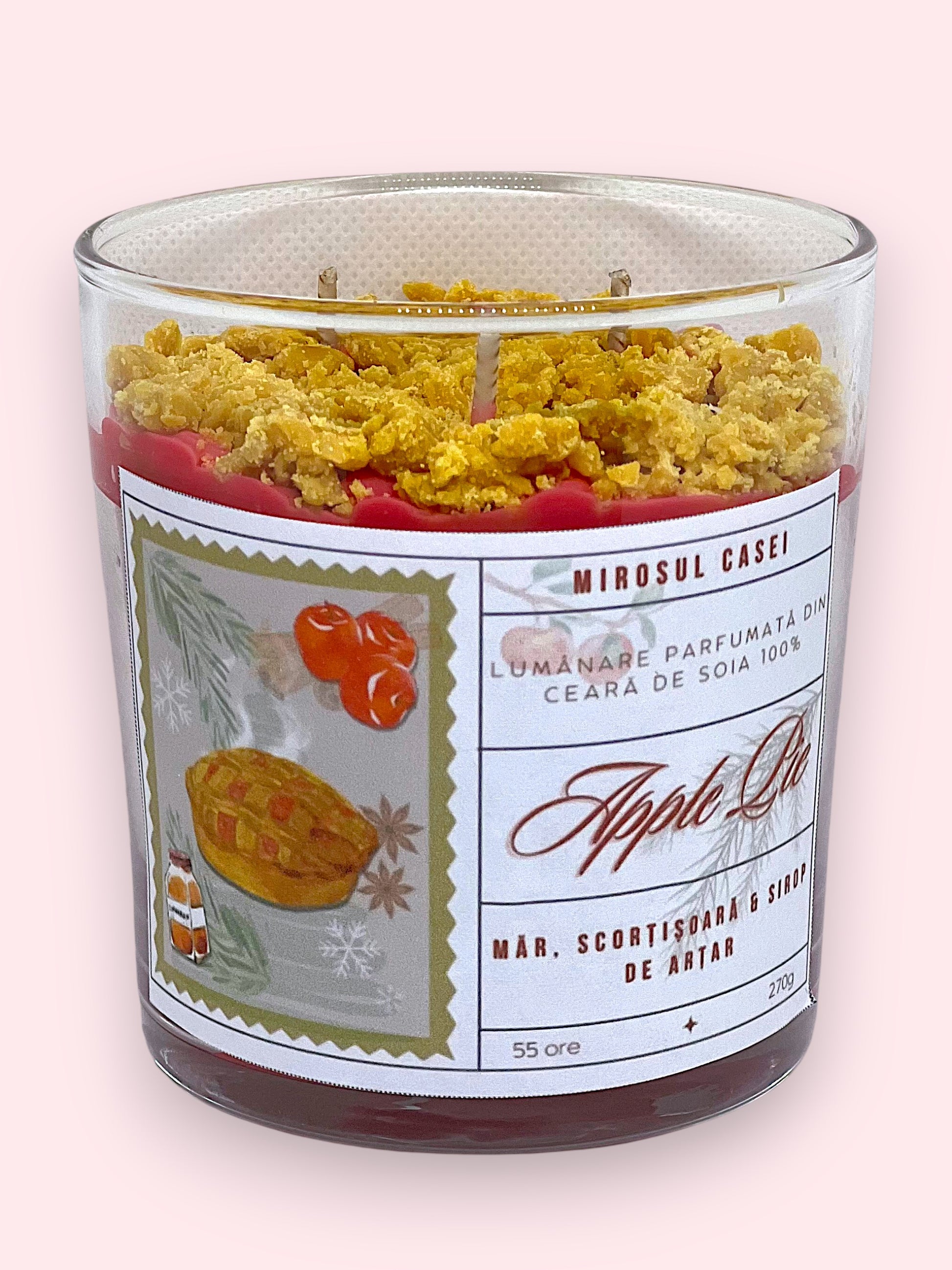 Apple Pie – lumânarea care transformă orice cameră într-o bucătărie caldă, luminată de brad și abur de plăcintă.